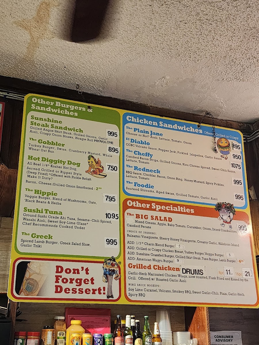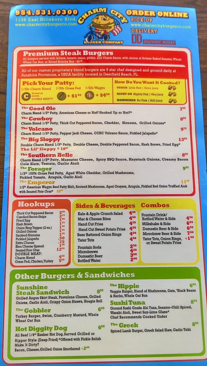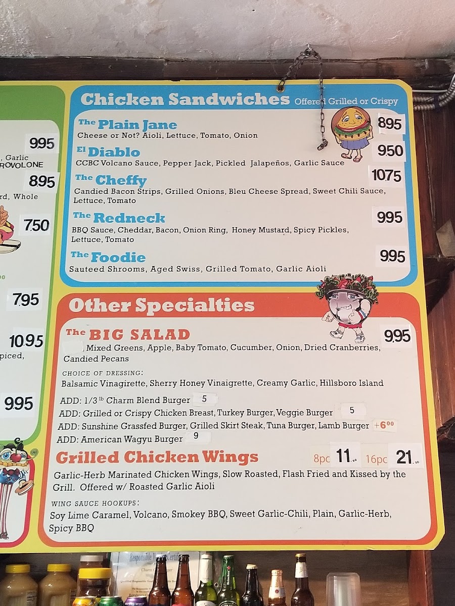 Our Original House Charm Blend Patty, sold ONLY here! 1/3lb Charm Blend Burger, offered with Cheese or without, Lettuce, Tomato, Raw Onions, Pickle and our Charm Sauce.
