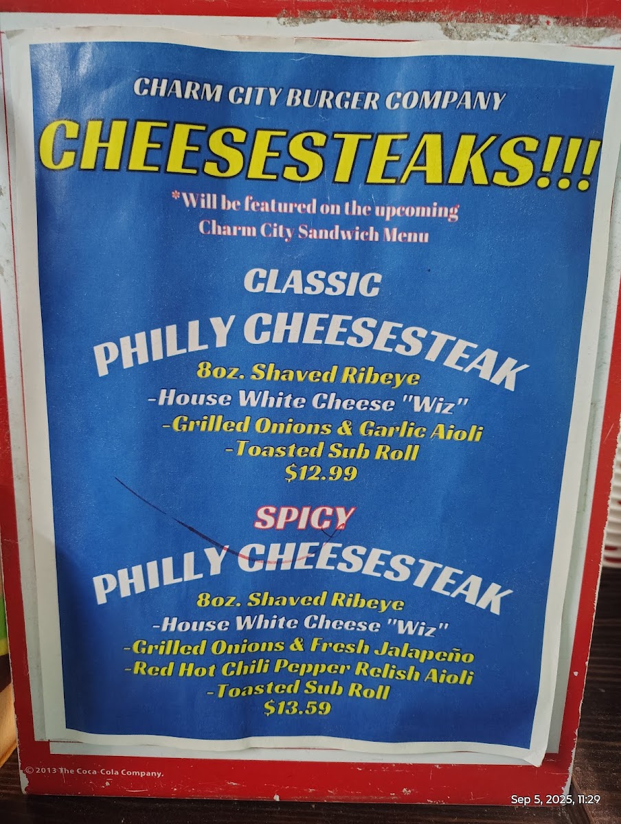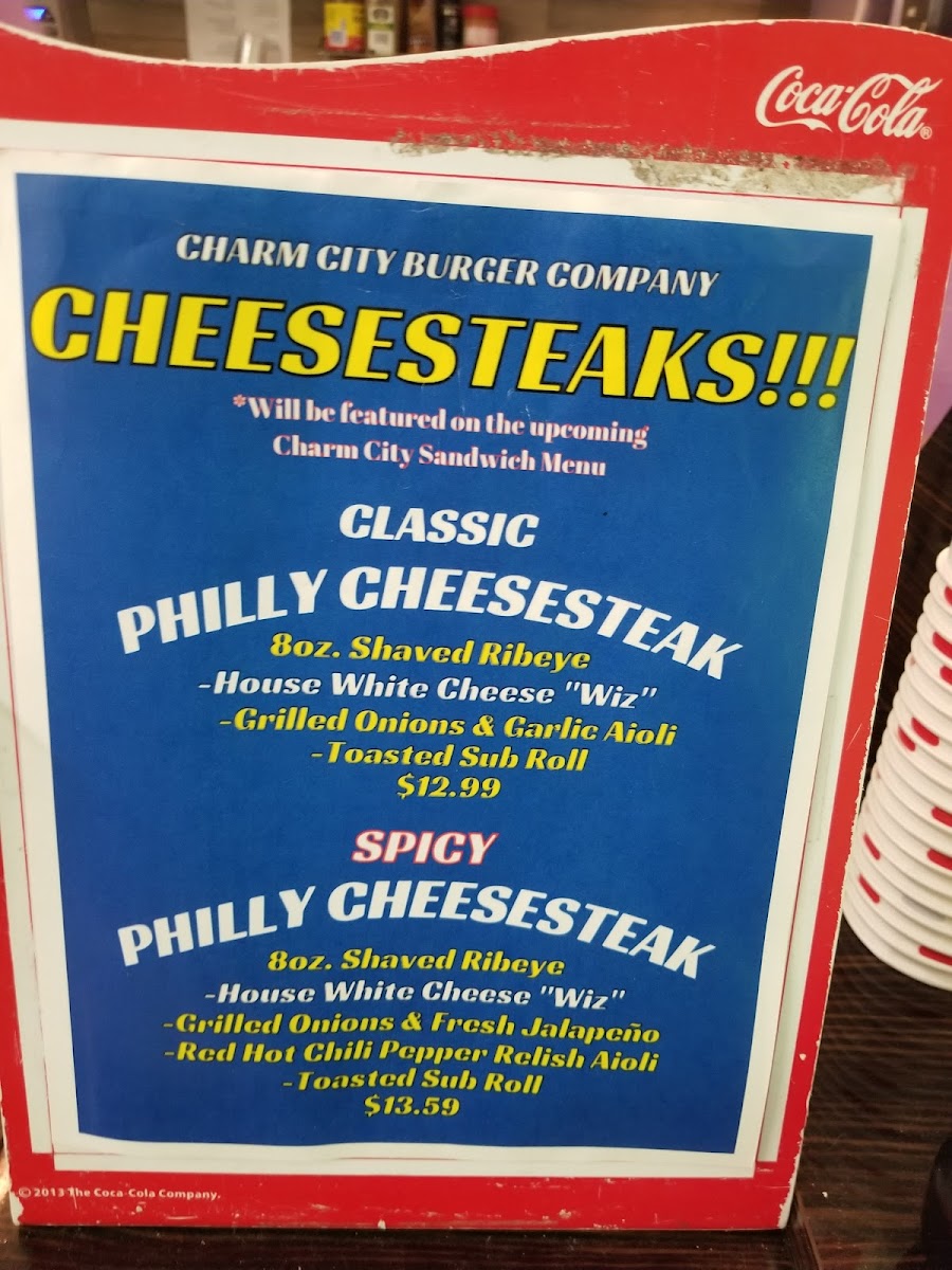 PHILLY CHEESESTEAK! Classic or Spicy Classic. 8oz. Shaved Ribeye, Grilled Onions, Garlic Aioli, Homemade White Cheese “Wiz” Toasted Sub Roll $12.99 Spicy. 8oz Shaved Ribeye, Grilled Onions, Fresh Jalapeño, Homemade White Cheese “Wiz”, Red Hot Chili Pepper Relish Aioli, Toasted Sub Roll. $13.59